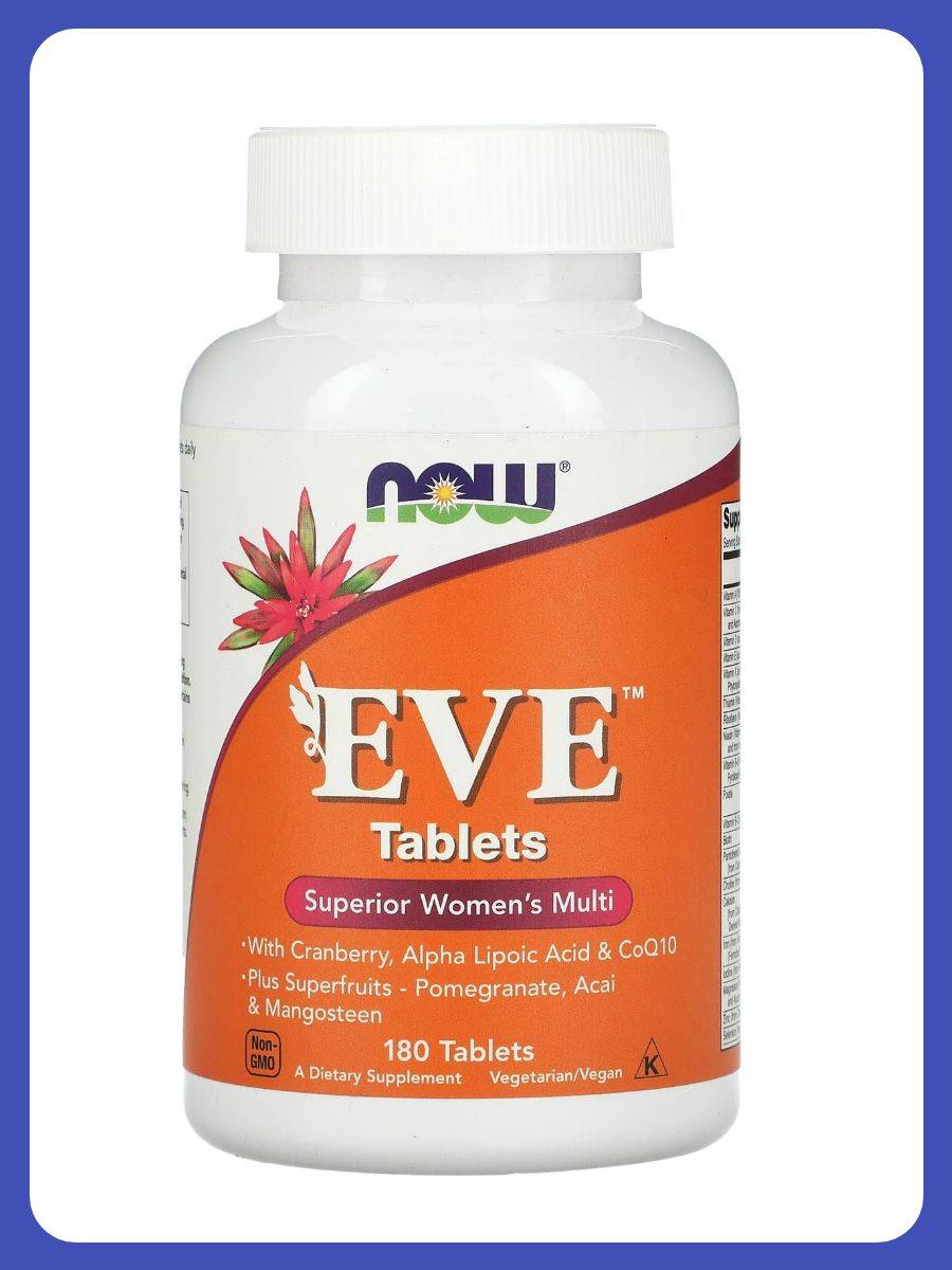 NOW Foods Eve is a dietary supplement formulated to support women's health through a blend of essential vitamins and nutrients. Designed for adult women, this multivitamin addresses key areas such as immunity, energy, and overall wellness. The product is manufactured in the USA and comes in a plastic jar packaging for convenience.