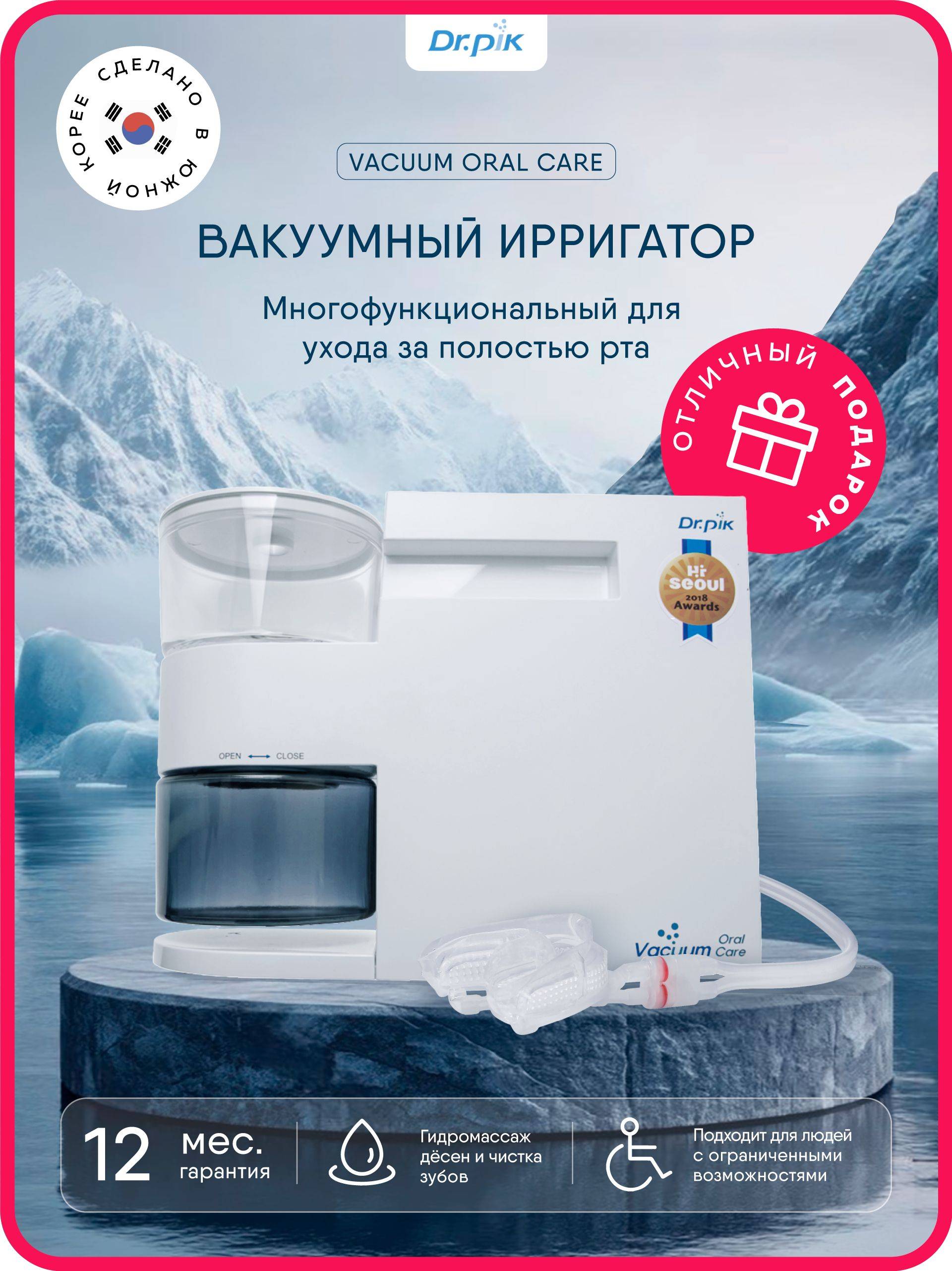 The Dr.Pik Vacuum Oral Care Irrigator uses a vacuum‑assisted water stream to clean teeth and massage gums. Designed for home use and dental offices, it helps remove plaque and food particles from hard‑to‑reach areas.