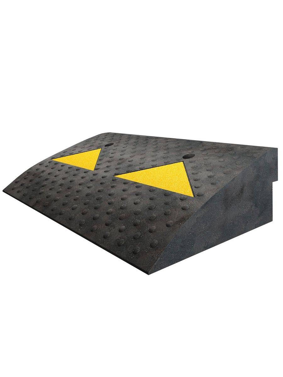 This composite step from Tekhnologiia is designed for seamless integration with curbs, featuring a durable polymer-sand mixture construction in black with yellow reflective strips for enhanced nighttime visibility. Its primary function is to facilitate smooth vehicle and wheelchair access by compensating for height differences at curbs or obstacles.