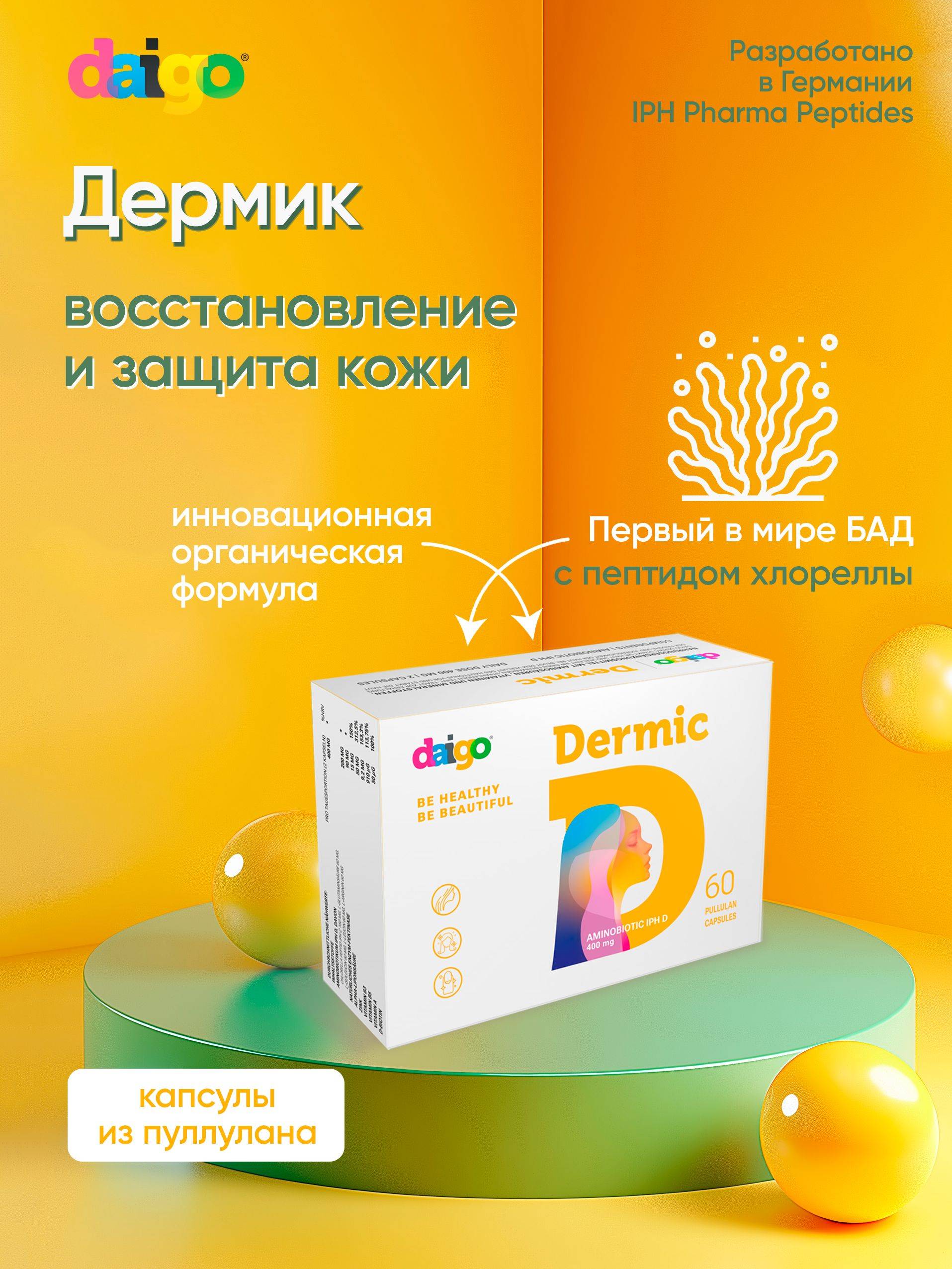 Daigo Dermic is a dietary supplement designed to support the health of hair, nails, and skin. Formulated with a chlorophyll peptide and essential amino acids, it works at the cellular level to enhance the protective and aesthetic functions of the skin. This supplement is intended for adults seeking to maintain or improve the appearance and condition of their hair, nails, and skin.