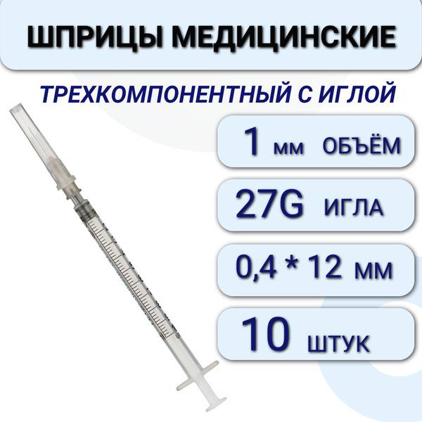 High-quality, sterile, single-use 1ml syringes designed for subcutaneous, intramuscular, and intravenous injections, as well as cosmetic and other medical/diagnostic procedures. This pack contains 10 individually wrapped, three-part syringes featuring a smooth-gliding, latex-free piston for comfortable and precise medication delivery. The transparent barrel allows for easy monitoring of medication and air bubble detection, while the graduated markings ensure accurate dosage. The secure piston prevents medication loss. Made from medical-grade polypropylene. Suitable for various applications, including automotive and lubrication purposes.