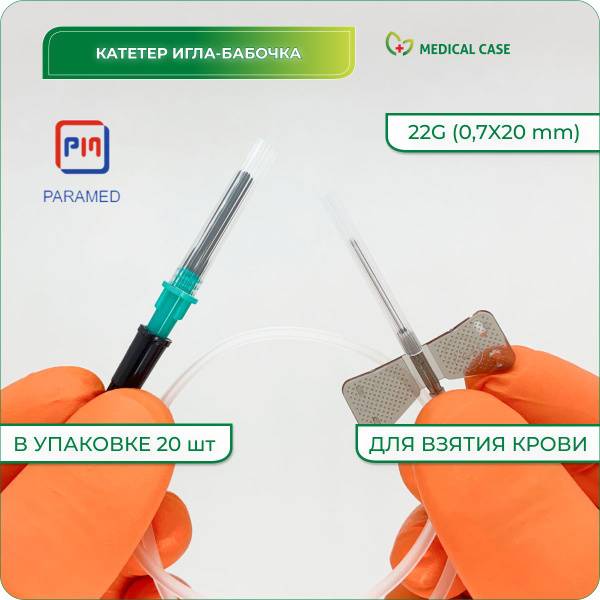 PARAMED 22G x 3/4" (0.7 x 20mm) sterile, disposable butterfly infusion sets with a 300mm catheter are designed for efficient blood collection, particularly beneficial for challenging patients in pediatrics, veterinary medicine, and intensive care units. Each set includes a butterfly needle, latex-free catheter, and a luer adapter. The flexible catheter and wings ensure secure venous access and minimize vessel wall damage. The color-coded system corresponds to standard needle sizes. Individually packaged for sterility and featuring clear labeling and instructions. This 20-unit pack is ideal for quality testing before purchasing larger quantities (100 units). Registered Medical Device: RZN 2023/20158 (April 26, 2023). Manufactured by Weihai Optech Medical Instruments Co. LTD, China.