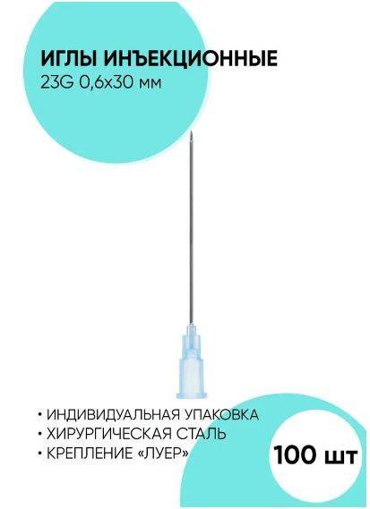 Description: These sterile, disposable 23G 0.6x30mm medical injection needles feature a Luer tip for seamless compatibility with a wide range of syringes and infusion/transfusion systems. Ideal for intramuscular, intradermal, and subcutaneous injections, as well as blood collection. The Luer tip ensures compatibility with syringes of various volumes and connector types (Luer and Luer Lock). Color-coded according to international ISO standards for easy size identification. Each needle is individually packaged and includes Russian language instructions. The needle boasts a three-bevel, ultrasonically sharpened tip for a less painful injection experience. Sterilized using Ethylene Oxide (EO). Buy your 100-pack today for reliable, high-quality injections.