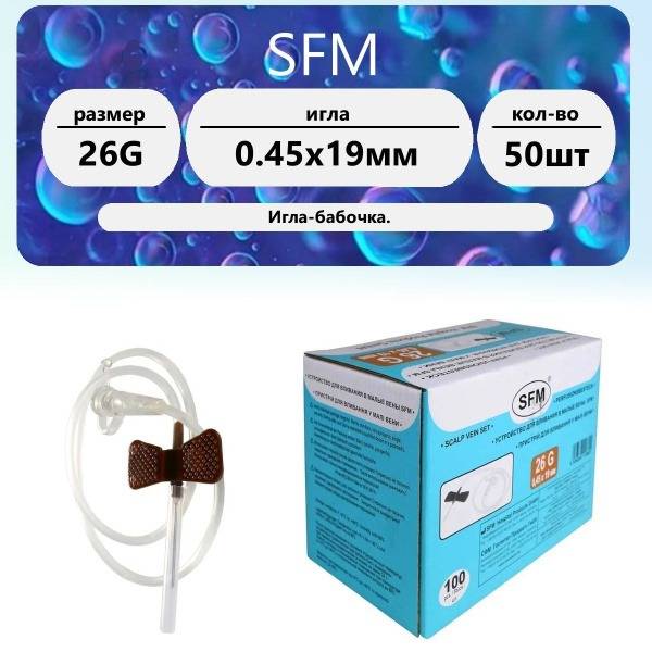 The SFM 26G Butterfly Infusion Set offers a superior solution for intravenous access in delicate veins. This single-use device features a comfortable, siliconized 26G (0.45x19mm) needle with a specialized bevel for minimally invasive insertion. The distinctive "butterfly" design, with its flexible wings, ensures secure and stable placement on the patient's skin. These wings are color-coded according to ISO standards, clearly indicating the needle gauge and diameter.
