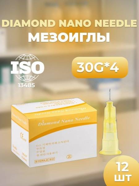 Diamond Nano Needle 30G x 4mm disposable injection needles are manufactured to meet international ISO standards. These ultra-fine needles feature a three-faceted, ultrasound-sharpened tip for minimal pain and precise injections. The yellow color-coding adheres to international ISO standards for easy size identification. Compatible with Luer and Luer-Lock syringes, infusion, and transfusion systems, these needles are ideal for administering medications, drawing blood, and blood transfusions. Each pack contains 12 sterile needles. Perfect for professional mesotherapy treatments and various medical applications.