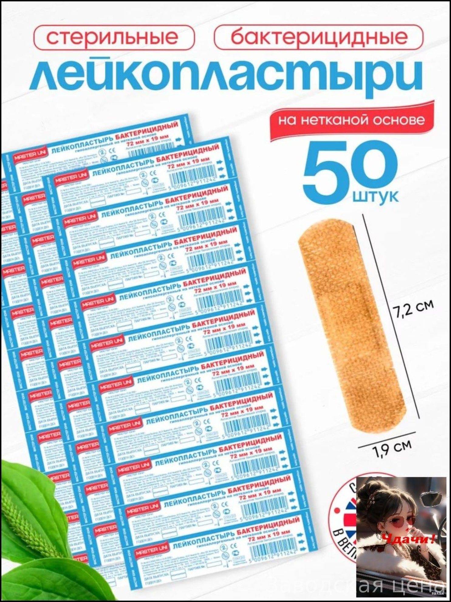 Each bandage measures 7.2 x 1.9 cm and is available in a beige color. The product is packaged in a set of 50, offering a practical solution for everyday first aid needs.