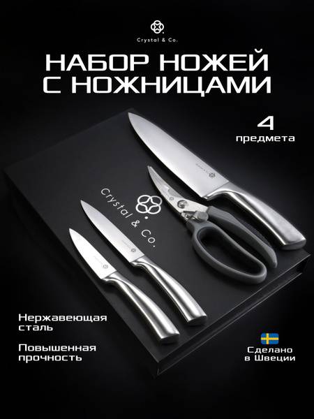 Description: Elevate your culinary experience with the Crystal & Co. 4-piece "Knife" kitchen knife set. Crafted in Sweden using innovative technology and decades of metalworking expertise, these knives boast exceptional quality and durability. Forged from a proprietary steel alloy meticulously balanced with iron, carbon, and select alloying elements, the blades offer superior resistance to corrosion, wear, and damage. A multi-stage hardening process, including cryogenic treatment, ensures unparalleled sharpness and prevents food particles from lodging in the bolster, eliminating corrosion and deformation. This set includes versatile, easy-to-clean stainless steel kitchen shears with non-slip handles, perfect for meat, fish, vegetables, and herbs. Each blade undergoes rigorous quality control testing to guarantee perfection. Presented in a sophisticated gift box, this professional-grade knife set makes a memorable present for birthdays, weddings, housewarmings, holidays, and more – ideal for home cooks, professional chefs, and discerning food enthusiasts who appreciate style, quality, and effortless performance.