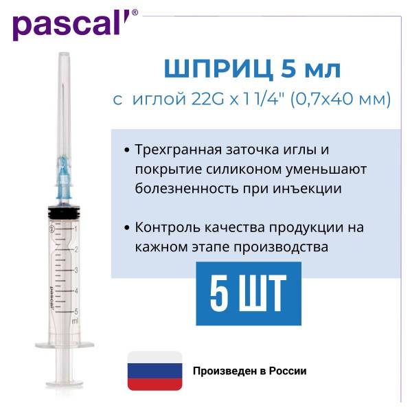 Sterile, single-use, 3-part Luer-slip 5ml injection syringe with a detachable 22G x 1 1/2" (0.7x40mm) needle. Pack of 5.