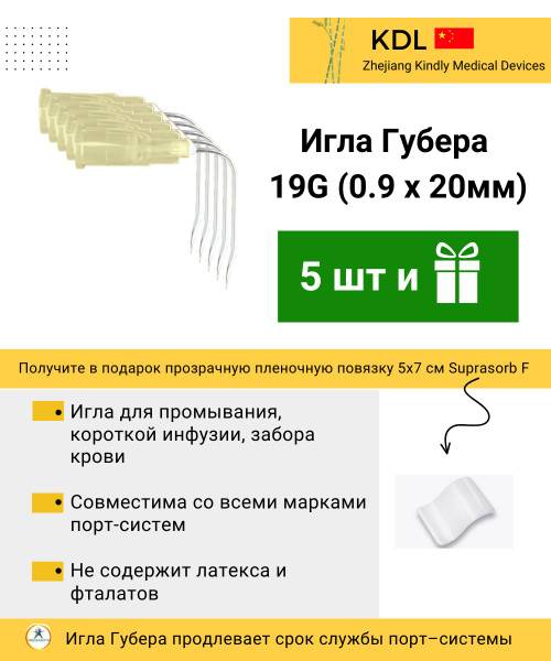 These 19G (1.1mm) x 20mm curved Huber needles from KDL are specifically designed for safe and comfortable port access. Ideal for short-term infusions and flushes (up to 30 minutes), their unique, triple-bevel design minimizes patient discomfort during insertion and therapy. Unlike standard injection needles, the curved tip of the Huber needle prevents scratching or pulling of port fibers, extending the lifespan of your implanted port. Made from high-quality medical-grade stainless steel, each needle is individually sterile-packed. This 5-pack includes a bonus Suprasorb F 5 x 7cm dressing, featuring a moist wound healing environment, oxygen permeability, and a barrier against external microorganisms and water. Its transparency allows for easy monitoring of the wound. Sterile.