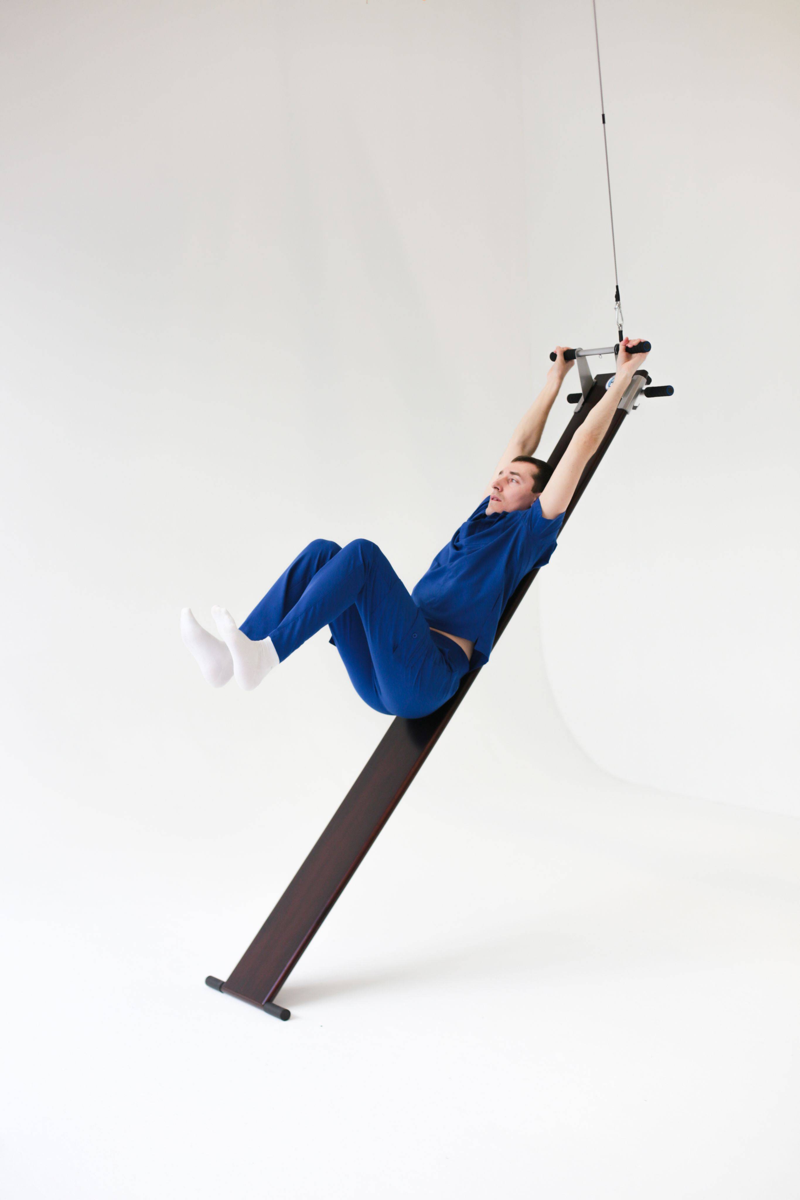 The Evminov Center Profilaktor Standard 235 Dark is a multi-functional inversion table designed for spinal health and rehabilitation. Constructed from wood and metal, it features an adjustable aluminum carriage and a sloped wooden panel for targeted exercises. Ideal for users up to 185 cm tall and 110 kg weight, it supports back pain relief, posture correction, and muscle strengthening through guided movements.