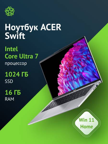 Acer Swift Go, Acer Swift Go 14, Intel Core Ultra 7, Intel Core Ultra 7 155H, 16GB RAM, 1TB SSD, 2.8K laptop, lightweight laptop, portable laptop, thin laptop, student laptop, business laptop, Intel Arc Graphics, Windows 11 Home, Thunderbolt 4, fast charging, aluminum laptop, Russian keyboard layout
