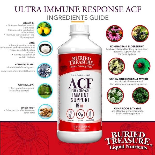 Buried Treasure ACF Immune Support Extra Strength 19-in-1 is a liquid, natural, high-potency formula featuring a blend of herbs, botanical extracts, vitamins, and minerals for advanced immune support. This powerful, systemically-strengthening formula employs a synergistic blend of natural, bioactive herbs, botanicals, vitamins, and minerals, working together to provide comprehensive, rapid immune system support.