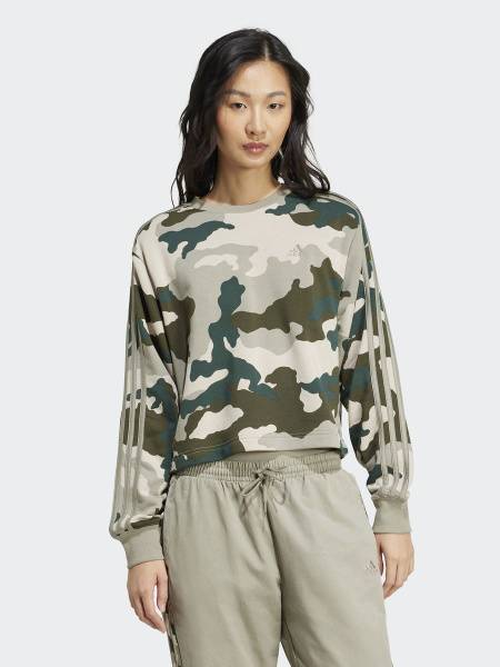 Description: The adidas Sportswear Women's Camo AOP Sweatshirt offers unparalleled comfort and durability with its premium cotton and polyester blend. The striking camouflage print adds a unique edge to this stylish sweatshirt. Its modern design effortlessly blends sporty chic with everyday wearability. Pair it with jeans, leggings, or shorts to create a variety of effortlessly fashionable looks.