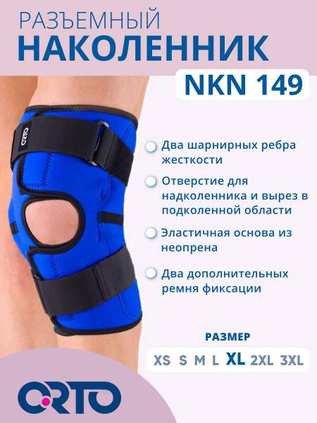 The ORTO NKN 149 hinged knee brace provides semi-rigid support for the knee joint. This adjustable, neoprene knee support features a patellar opening, popliteal cutout, and two removable, articulating side hinges within protective pockets. These hinges offer single-axis rotation with a stop limiting hyperextension to 180°. Dual straps with Velcro closures secure the brace to the thigh and calf, further stabilizing the knee. The 32cm high brace offers superior comfort for extended wear.