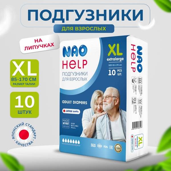 Experience superior comfort and reliable protection with NAO Help Adult Diapers, Size XL. Designed for both men and women requiring assistance with personal hygiene, these diapers offer a secure fit for waist sizes ranging from 33.5" to 61" (85cm to 155cm). Each pack contains 10 diapers, providing a convenient supply for your needs.