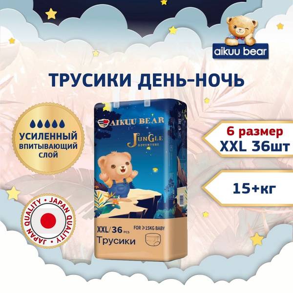 Keywords: AIKUU BEAR, Jungle Adventure, diapers, pull-ups, baby diapers, overnight diapers, daytime diapers, size XXL, 15+ kg, 36 count, super absorbent, leak proof, hypoallergenic, natural materials, comfortable, soft, breathable, baby skin, diaper rash, baby care, pull-up diapers, 3D leak guards, night diapers, day diapers.