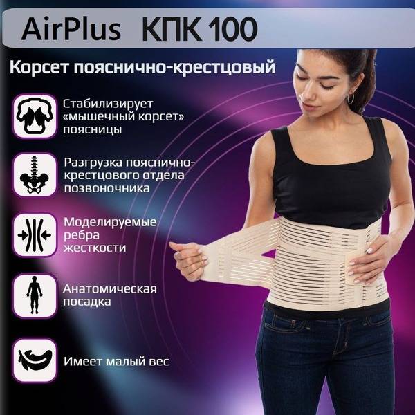 Lumbar support belt, sacral support belt, back brace, AirPlus КПК-100, semi-rigid back support, back pain relief, posture support, breathable back brace, spinal support, injury recovery, post-surgery recovery, osteochondrosis, osteoporosis, herniated disc, protrusions, muscle strain, myositis, radiculitis, spondylosis, osteoarthritis, Velcro closure, beige back brace, comfortable back support.