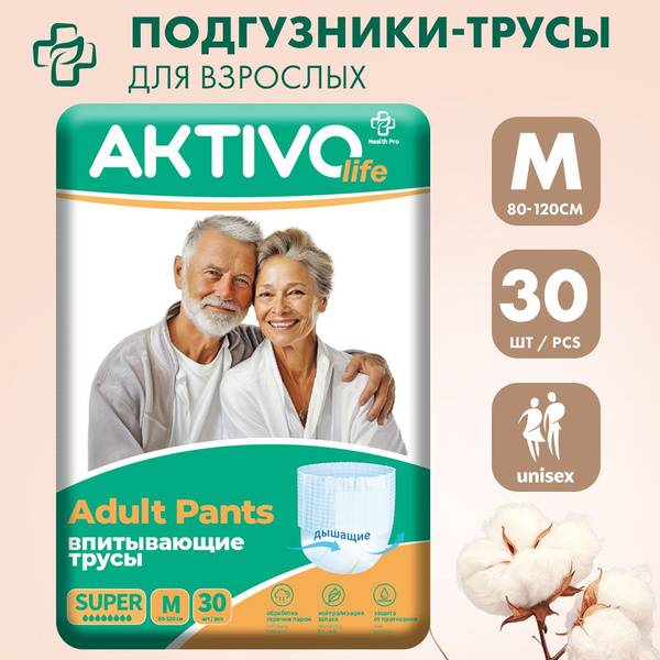 AKTIVO Life adult diapers, adult diaper pants, incontinence diapers, breathable diapers, hypoallergenic diapers, 80-120cm, size M, moderate incontinence, severe incontinence, eco-friendly diapers, dermatologically tested diapers, absorbent diapers, leak protection, adult diaper pants for active individuals, adult diapers for bedridden patients.