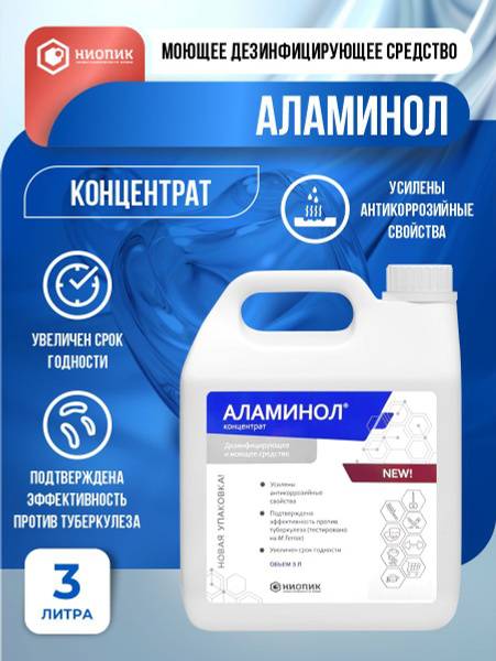 "description": "Alaminol is a highly effective disinfectant concentrate (3 liters) ideal for various settings. This vibrant blue, transparent liquid boasts a mild fragrance and mixes easily with water, ensuring economical use. Proven effective in diverse organizations, Alaminol maintains its disinfecting properties even after freezing (at temperatures above -5°C). Its pH level is 3.8±1.2.",