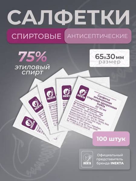 INEKTA alcohol wipes offer superior disinfection for a variety of applications. Each individually-wrapped wipe measures 65mm x 30mm (approximately 2.6" x 1.2"), providing convenient and effective germ-killing power. This 100-count pack is perfect for individual or professional use.