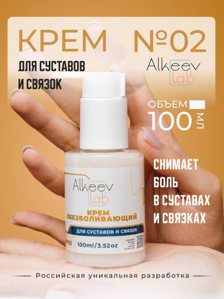 Alkeev LAB #02 is a pain-relieving cream for joints, muscles, back, and body, supplied in a 100ml bottle with a dispenser. Shelf life: 12 months.