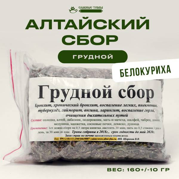Altai herbs, herbal chest collection, expectorant, antimicrobial, cough relief, bronchitis, tracheitis, pneumonia, sinusitis, tonsillitis, laryngitis, sore throat, respiratory health, natural remedies, herbal remedy, Belokurikha, Altai Krai, Russia, 160g, herbal tea, natural cough suppressant, herbal supplement.