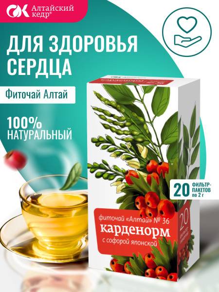 Altai Phytotea No. 36 Cardinorm is a natural herbal blend formulated to support cardiovascular health. This carefully selected blend, featuring Japanese Sophora, is designed to improve the functional state of the cardiovascular system and reduce the risk of cardiovascular disease. Rich in natural bioflavonoids, notably rutin, it strengthens blood vessel walls, reduces capillary fragility and permeability, prevents blood clot formation, and acts as a powerful antioxidant.
