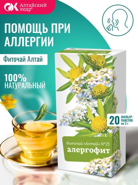 Altai Herbal Tea No. 25 AllergoFit is a natural herbal blend formulated to provide relief from various allergic manifestations. This soothing tea supports overall health, strengthens the immune system, and helps reduce the body's hypersensitivity to allergens. It offers anti-itching, calming, anti-inflammatory, and diuretic effects. The carefully selected herbs include: