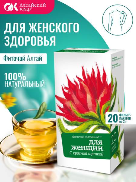 Keywords: Altai herbal tea, women's health tea, red brush tea, herbal tea for women, gynecological tea, mastopathy, uterine fibroids, endometriosis, irregular menstruation, painful menstruation, menopause support, vitamin C, rosehip tea, motherwort, St. John's Wort, hawthorn, coltsfoot, horsetail, elecampane, calamus root, natural herbal remedy, female reproductive health, hormonal balance, Altai herbs, 20 tea bags.