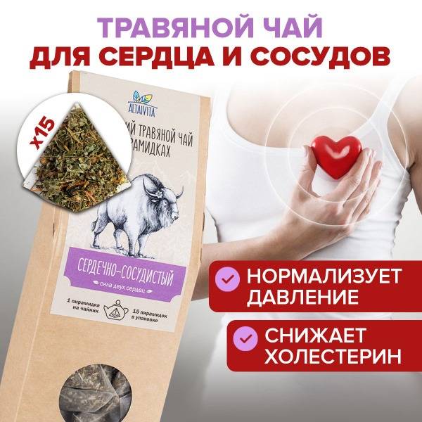 Cardiovascular tea, herbal tea, heart health, atherosclerosis prevention, blood pressure support, AltaiVita, Ziziphora, Hawthorn, Motherwort, St. John's Wort, Lemon Balm, Clover, Rhodiola Rosea, Raspberry Leaves, lymphatic drainage, 60g, pyramid tea bags, healthy heart, blood circulation, high blood pressure, cholesterol reduction, over 50, natural remedy.