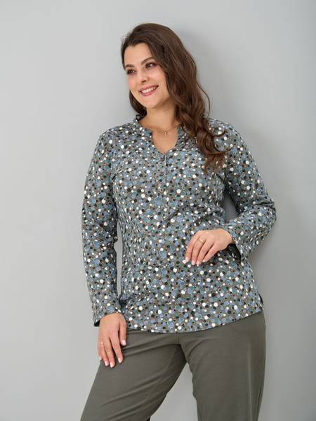 This versatile Altex women's cotton blouse is perfect for work, weekends, and everything in between. Made from 100% soft cotton knit, this plus-size friendly blouse features a flattering neckline and a button-front closure. It's stylish, comfortable, and makes a perfect gift for any occasion. Made in Russia with high-quality craftsmanship. This comfortable work blouse is also great as a women's cotton shirt.
