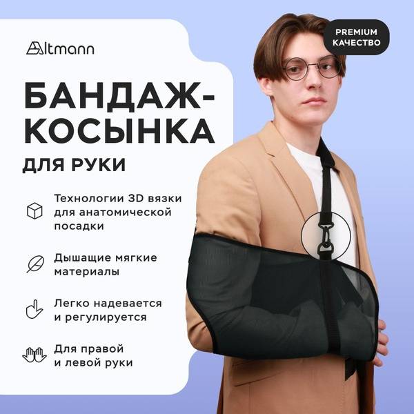 The Altmann sling bandage provides reliable support and immobilization for the arm and shoulder, ideal for post-injury recovery and fracture support. This lightweight, breathable arm orthosis is designed for the elbow and forearm, offering comfortable immobilization of the upper limb. The versatile Dezo sling design is suitable for both the left and right arm thanks to its rotating carabiner. It's perfect for recovery from fractures, dislocations, bruises, and ligament damage to the shoulder, elbow, wrist, and hand. This arm support, splint, and brace promotes functional rest for soft tissues, accelerating rehabilitation and reducing pain associated with arthritis, arthrosis, and tendinitis in the arm and shoulder. Its adjustable, anatomical design with a customizable shoulder strap accommodates various body types and arm lengths, making it suitable for children, men, and women.