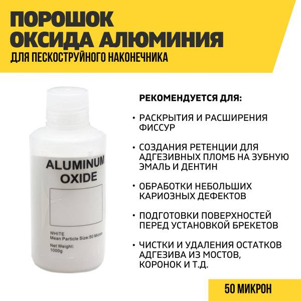 Keywords: Aluminum oxide powder, dental air abrasion, 50 micron, abrasive powder, dental prophylaxis, fissure opening, micro-mechanical retention, caries preparation, adhesive removal, orthodontic bonding, crown and bridge cleaning, pediatric dentistry, 30 micron, dental materials, dental supplies
