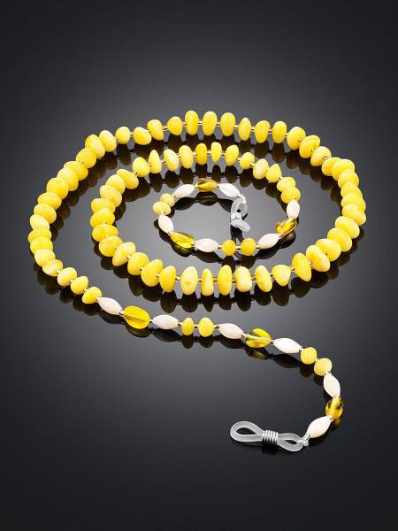 Description: Elevate your eyewear style with this exquisite eyeglass chain crafted from genuine Baltic amber. Featuring light honey-colored amber beads with delicate pearl accents, this chain is both functional and fashionable. More than just a practical accessory, it's a chic statement piece, keeping your glasses secure and adding a touch of elegance to any outfit. This season's must-have accessory, as seen on top fashion bloggers and models. Prevent lost or dropped glasses with effortless style. Bead size: up to 7x6x3 mm. Length: 67 cm.