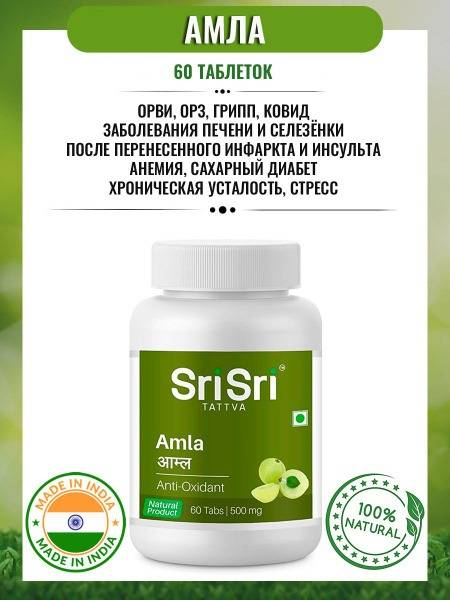 Keywords: Amla, Amalaki, Indian Gooseberry, Sri Sri Tattva, immune support, immunity booster, liver health, spleen health, anemia, diabetes, Vitamin C, antioxidant, anti-inflammatory, Ayurvedic, rejuvenation, hair growth, skin health, cold, flu, viral infection, recovery, stress relief, energy booster, digestive health, nervous system support, Chavanprash, Triphala, Phyllanthus emblica, supplement, tablets, 60 tablets, India, Sri Sri Tattva.
