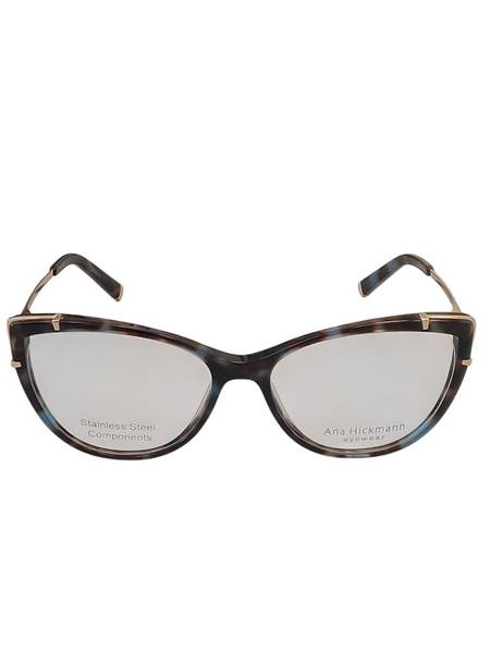 Authentic Ana Hickmann eyeglasses feature a glossy, two-toned plastic frame in a classic cat-eye shape. Gold metal temples elegantly display the brand name. The two-toned plastic temple tips are accented with gold detailing, mirroring a sophisticated gold element on the frame itself. This distinctive design creates a truly memorable look.