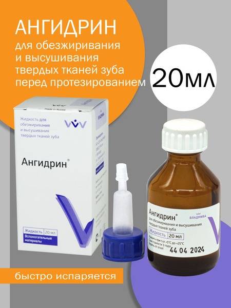Keywords: Angidrin, dental fluid, dehydration, degreasing, teeth, prosthetics, crowns, bonding, cement, sensitivity reduction, biocompatible, non-irritating, dental procedure, dental materials, pediatric dentistry, adult dentistry, 20ml, fast drying.