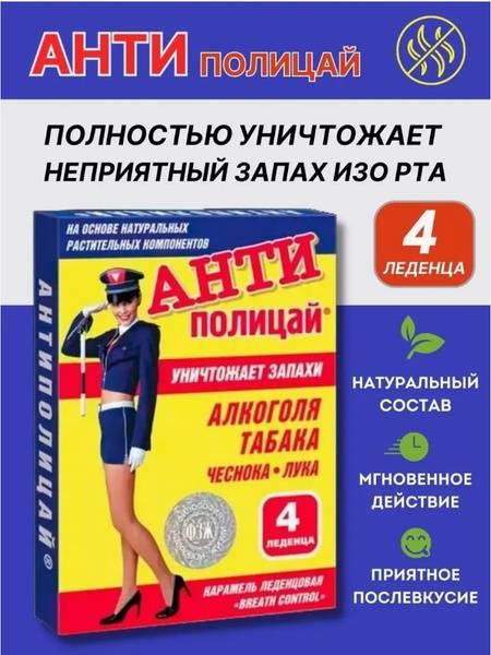 Eliminate alcohol and tobacco odors instantly with Anti-Police lozenges. Made with natural ingredients like malt root, eucalyptus oil, and acacia gum, these lozenges effectively neutralize bad breath. One pack contains 4 convenient lozenges for fresh breath on the go.