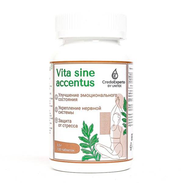 Anti-stress supplement, stress relief, anxiety relief, valerian root, motherwort, hawthorn, natural sleep aid, relaxation supplement, emotional well-being, calm, tranquility, stress management, herbal supplement, CredoExperto, Vita sine Accentus, 120 tablets.