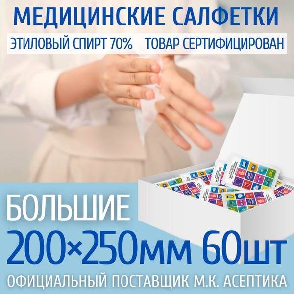 Powerful antiseptic and antibacterial alcohol wipes, measuring 200x250mm. This bulk pack contains 60 individually wrapped wipes in a convenient display box. Each "Aseptica" wipe is made from a durable, non-woven material (35gsm minimum) and saturated with a 70% ethyl alcohol solution, ensuring effective antimicrobial and sterilizing properties. Ideal for surface disinfection. The airtight individual sachet packaging maintains the wipes' antimicrobial effectiveness throughout their shelf life.