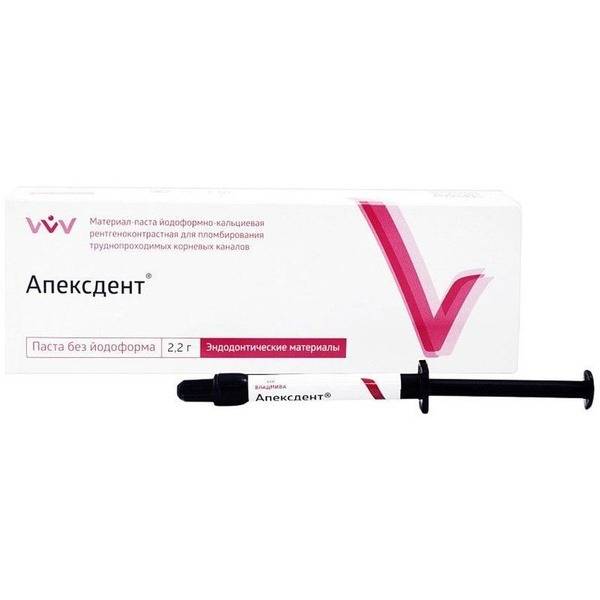 Apexdent, root canal sealer, calcium hydroxide, iodoform-free, endodontic paste, root canal filling, apexogenesis, apexification, pulpitis treatment, chronic periodontitis, root perforation repair, radiopaque, dental material, bone regeneration, periapical healing, immature teeth, primary teeth, permanent teeth, VladMiVa.