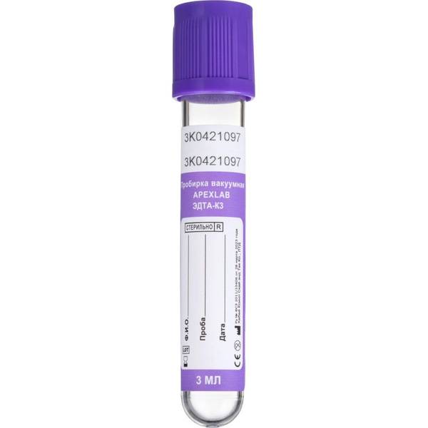 High-quality 3ml K3 EDTA vacuum blood collection tubes from ApexLab, ideal for hematology testing. These 13x75mm plastic tubes feature a two-component closure system: a rubber stopper with a central well and a hemolytic repellent coating, and a secure, non-threaded, leak-proof polymer cap with vertical grooves. The tubes are color-coded purple for easy identification. Each pack contains 100 tubes. Order your supply of reliable, efficient blood collection tubes today.