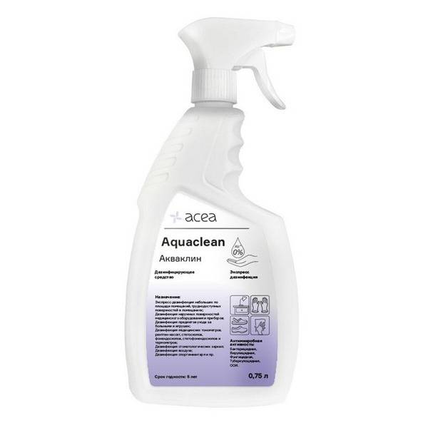 Aquaklin 750ml disinfectant spray provides broad-spectrum antimicrobial action against bacteria, viruses, and fungi. Its active ingredients include polyhexamethylene guanidine hydrochloride (0.25%), alkyldimethylbenzylammonium chloride (0.3%), and 2-phenoxyethanol (2%), complemented by skin-conditioning additives. Effective against Mycobacterium tuberculosis, Gram-positive and Gram-negative bacteria, herpes viruses, influenza A (including H5N1 and H1N1), Hepatitis A, B, and C, HIV, and various other pathogens. Suitable for use in a wide range of settings including healthcare facilities (including obstetrics/gynecology, neonatology, intensive care, dermatology/venereology), laboratories, ambulances, food processing, pharmaceutical and biotech industries, social care facilities, and educational institutions. Applications include hand hygiene for medical personnel, disinfection of gloves, surfaces, air, and medical equipment (including ultrasound transducers and stethoscopes). Shelf life: 5 years. Made in Russia.