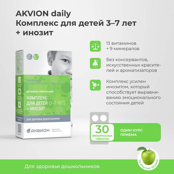 Aquion Daily is a delicious, apple-flavored chewable multivitamin specifically formulated for children aged 3-7. This comprehensive supplement provides essential vitamins and minerals in optimal dosages to support the growth and development of your child. Each bottle contains a one-month supply (30 tablets).