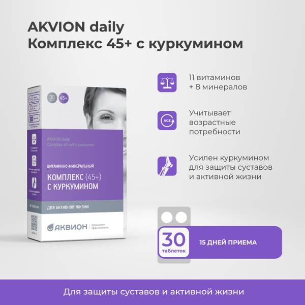 Aquion Daily 45+ with Curcumin is a comprehensive vitamin and mineral supplement formulated to meet the specific needs of adults over 45. This unique blend combines curcumin, chondroitin, and essential vitamins & minerals to support joint health, boost immunity, and promote overall well-being. Curcumin, a powerful antioxidant with anti-inflammatory properties, helps reduce joint stiffness and supports digestive health. Chondroitin, crucial for cartilage repair, contributes to healthy joint function. This daily supplement helps combat age-related deficiencies and promotes energy levels, supporting active lifestyles. Contains key vitamins including B1 (1.12mg), B2 (1mg), B3 (10mg), B5 (2.5mg), B6 (1mg), B9 (200mcg), B12 (1.5mcg), A (0.5mg), E (7.5mg), D3 (5mcg), C (35mg), plus Curcumin (7.5mg), Beta-carotene (2.5mg), Calcium (150mg), Magnesium (50mg), Iron (5mg), Zinc (6mg), Manganese (1mg), Copper (0.5mg), Iodine (75mcg), Chondroitin Sulfate (75mg), and Selenium (37.5mcg). Take one tablet twice daily.