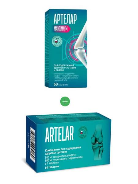 Artelar Tablets and Artelar Maximum offer comprehensive joint support, combining two powerful formulas in a convenient dual pack. Each pack contains 60 tablets (1470mg/1.1g). This joint support supplement features a unique combination of ingredients that promotes chondroprotection, significantly benefiting the restorative processes in intervertebral discs and facet joints of the spine. Experience effective joint pain relief and back pain relief through its analgesic and anti-inflammatory actions while simultaneously stimulating cartilage regeneration and improving muscle innervation. Artelar also supports the overall health of the nervous, muscular, and cardiovascular systems. This dietary supplement provides natural joint pain relief.