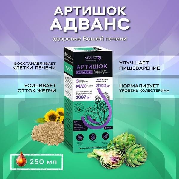 Artichoke Advance with Lecithin VitaUkt (250ml) offers comprehensive liver support and detoxification. This powerful formula combines the benefits of artichoke extract, rich in cynaropicrin, cynarin, luteolin, and chlorogenic acid, with the potent hepatoprotective properties of 2250mg of sunflower lecithin per daily dose. Artichoke's antioxidant and membrane-stabilizing actions help neutralize and eliminate toxins, including heavy metals, pesticides, and alkaloids. It promotes healthy bile production and flow, contributing to lower serum cholesterol levels by converting cholesterol into bile acids. This supplement also aids digestion and intestinal health. Spanish artichoke leaves contribute to cholesterol reduction by inhibiting hepatic cholesterol synthesis and lowering LDL cholesterol. The high concentration of phosphatidylcholines in lecithin supports liver cell membrane structure, regeneration, and function, reducing cellular damage and necrosis. Experience the restorative power of Artichoke Advance for optimal liver health and overall well-being.