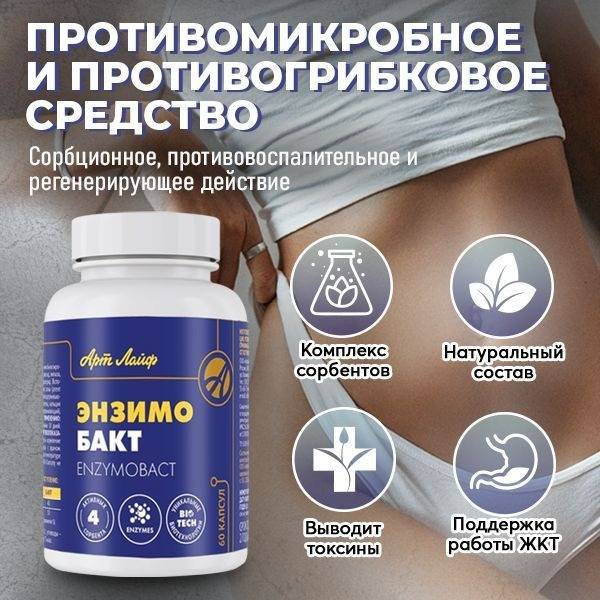 ArtLife Enzimobact, gut health, dysbiosis, candidiasis, antifungal, antibacterial, anti-inflammatory, sorbent, prebiotic, enzymes, metabiotics, beta-glucanase, chitosan, silicon dioxide, probiotics, digestive health, intestinal health, metabolic detoxification, immune support, Bacillus subtilis, Candida albicans, Kazakhstan