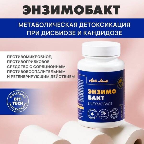 Keywords: ArtLife Enzymobact, Enzymobact, antimicrobial, antifungal, sorbent, regenerative, gut health, digestive health, probiotics, prebiotics, enzymes, silicon dioxide, chitosan, beta-glucanase, lysozyme, bromelain, lipase, papain, detoxification, anti-inflammatory, Candida albicans, intestinal microbiota, dietary supplement, health supplement, 60 capsules, 770mg