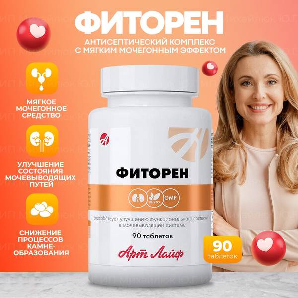 Phytoren, a 90-tablet bioactive complex, provides gentle diuretic support and helps maintain urinary tract health. This clinically proven formula features a blend of natural herbal extractsâincluding bearberry, parsley, uva ursi, birch extract, and cloverâto promote healthy urine flow and reduce the risk of kidney stone formation. Its anti-septic properties help combat urinary tract infections, while key ingredients like horsetail (rich in silica), licorice root, dandelion root, bromelain, L-arginine, vitamin C, magnesium, zinc, and potassium work synergistically to support overall urinary tract function. Ideal for those seeking to maintain urinary health, particularly with lifestyle factors like poor diet, lack of exercise, or smoking. Phytoren is a dietary supplement, not a medicine. One tablet provides 5mg of arbutin (60%), 5mg of glycyrrhizic acid (50%), 20mg of vitamin C (30%), 3.4mg of zinc (30%), and 25mg of tannins (13%) of the recommended daily intake.